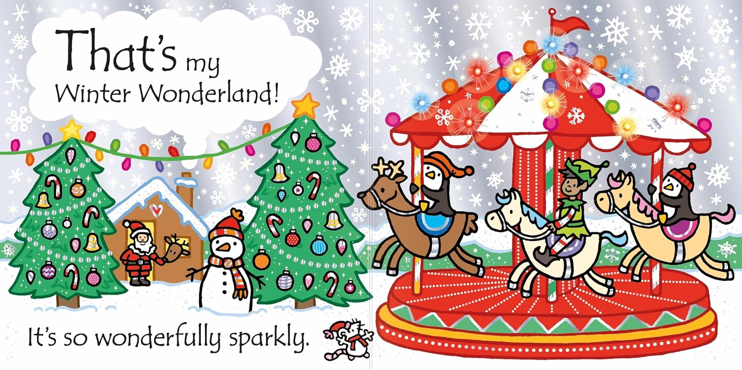 touchy-feely book explores delightful wintery scenes and features sparkly foiled pages as well as a light-up surprise. From penguins with fluffy tummies skating on a frozen pond, to Santa's magical workshop, to a snowflake scene lit with twinkling lights.