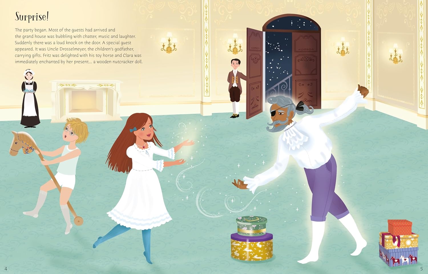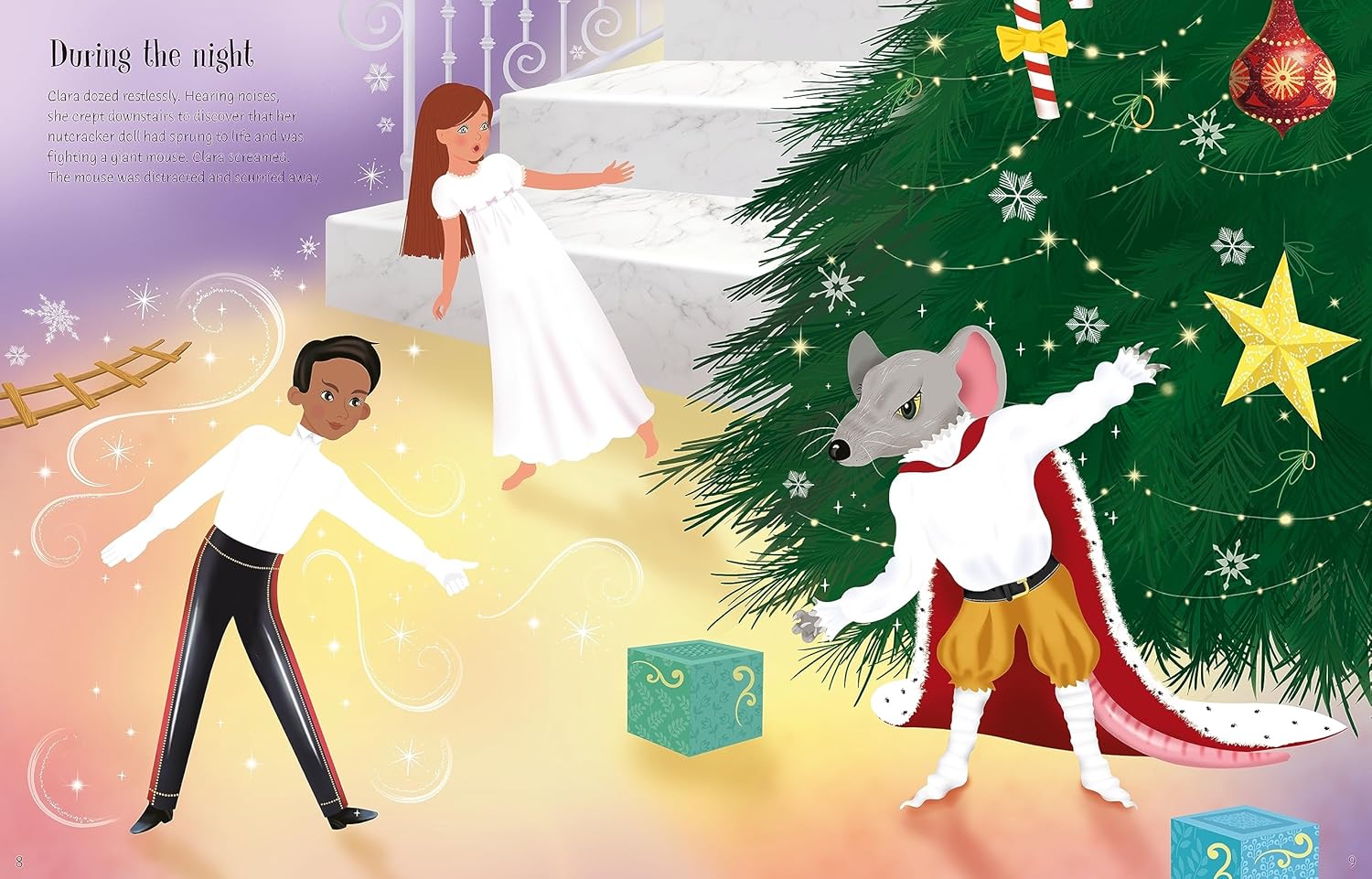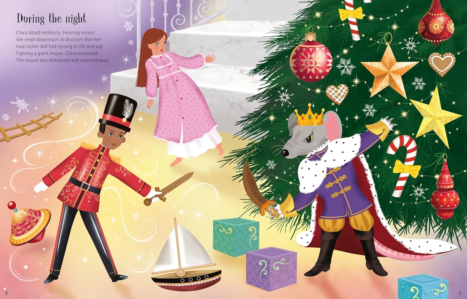 Unleash your imagination with Sticker Dolly Dressing! Transform the doll characters in this unique version of The Nutcracker ballet using the playful stickers. After receiving a nutcracker doll from her uncle for Christmas, Clara fights the evil Mouse King and witnesses a magical transformation into a prince. Together, they journey through a snowy forest, filled with spinning snowflakes, and reach the kingdom of the Sugar Plum Fairy, where everything is made of candy. But the question remains, was it all just a dream?