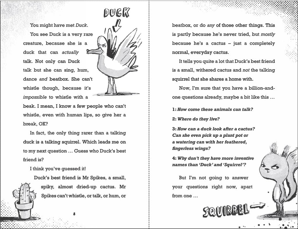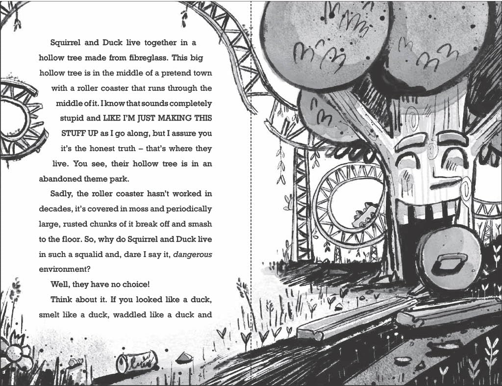 Squirrel and Duck might seem strange housemates but they are drawn together by their secret - they are the only two talking animals in the world! When bulldozers arrive to redevelop the abandoned theme park they call home, they run away, taking with them only Mr Spikes, Duck's beloved 'pet' cactus.