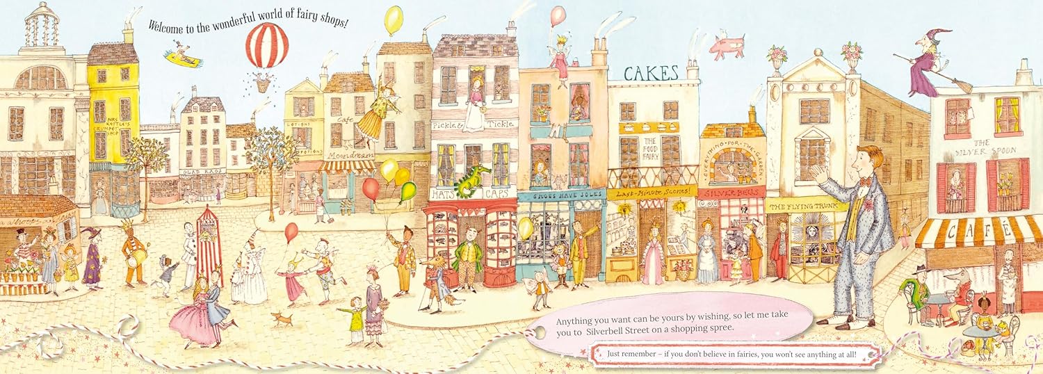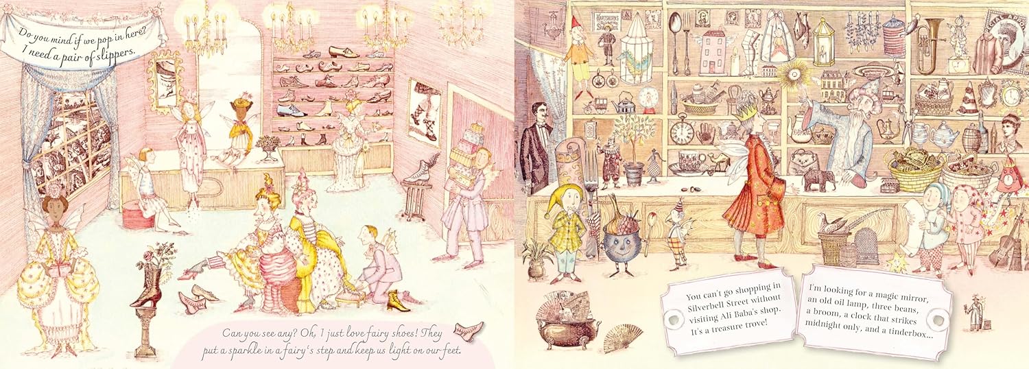 Take a stroll down Silverbell Street to find shops that never close - that is, if you believe in fairies. Discover a cloak of invisibility, a magic lamp, or an umbrella that will whisk you away to the stars. Indulge in scrumptious flying fairy cakes at the charming Foxglove Restaurant, or tag along with the fairies as they choose dazzling new dancing shoes and ball gowns. Kids will love searching for familiar giants, fairies, and witches hidden within the colorful illustrations. This beloved picture book has been revamped and refreshed for a new audience.